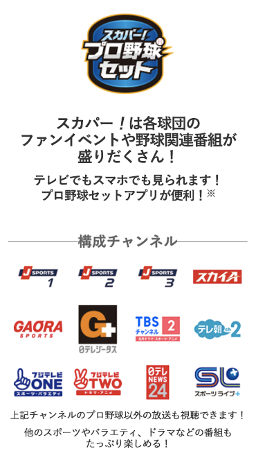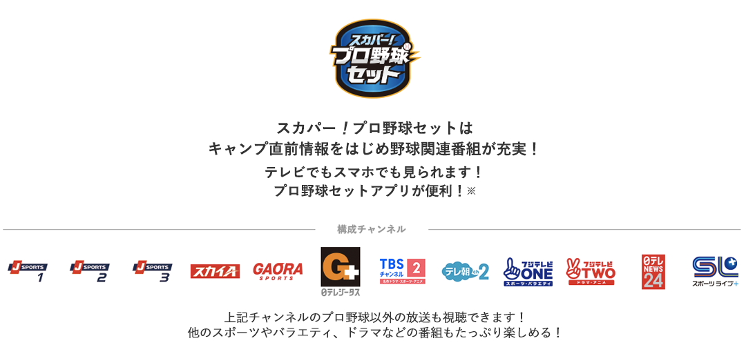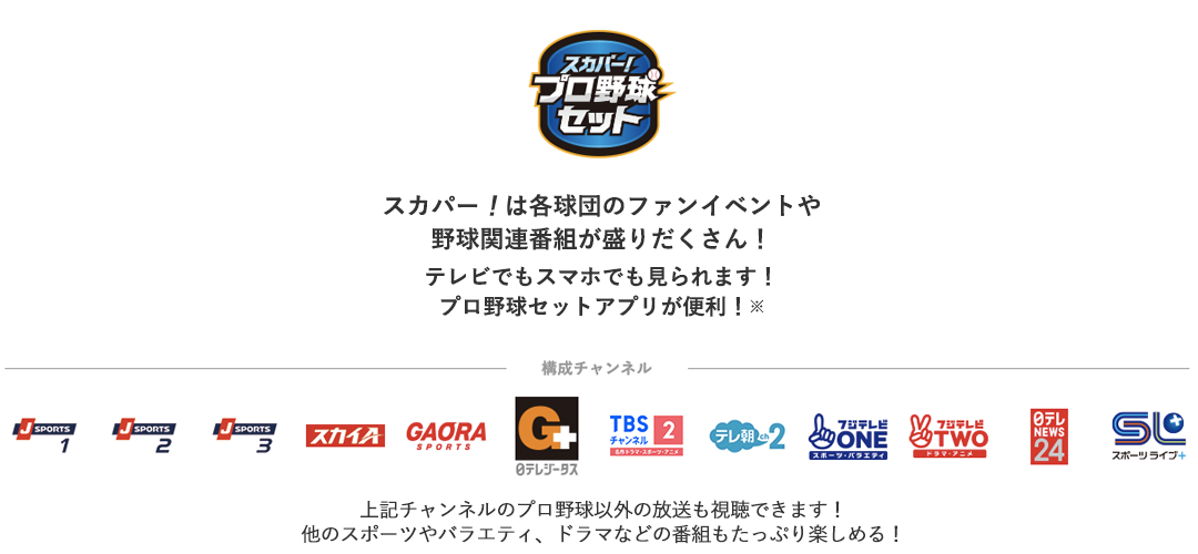 ※ 配信で視聴できる番組は、スカパー!プロ野球セットアプリまたは スカパー!公式サイトをご確認ください。