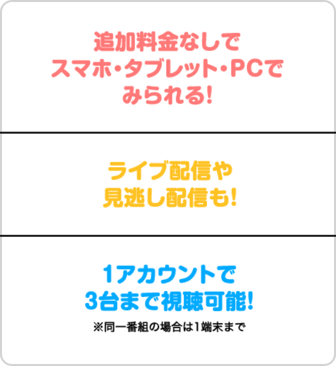 - ※視聴料に加え、基本料として429円/月(税込)がかかります。(加入月は基本料・視聴料ともにかかりません。)