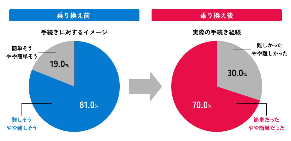 また、乗り換えを行う前の光回線の乗り換えのイメージについては、難しそう、やや難しそうと回答した方が、合計して全体の81%を占めましたが、実際に乗り換えを行った後の光回線の乗り換えに対する感想については、簡単だった、やや簡単だったと回答した方が、合計して全体の70%を占めました。