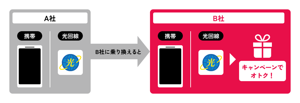 例えば、スマートフォンの端末の寿命や料金プランの見直しなどを理由に、キャリアの変更を検討しているとすると、あなたの携帯がA社、光回線もA社のコラボ光でまとめられていた場合、携帯も光回線もB社に契約変更することで、B社の携帯と光回線のキャンペーン2つが適用になることもあります。